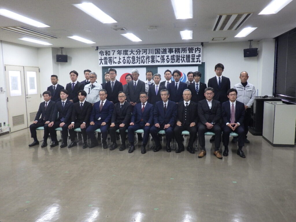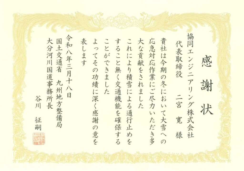 公開日:2026年3月18日 令和8年3月18日 国土交通省 九州地方整備局 大分河川国道事務所において、感謝状贈呈式が行われ、 弊社に「令和7年度 大雪等による雪寒対応作業に係る感謝状」が授与されました。